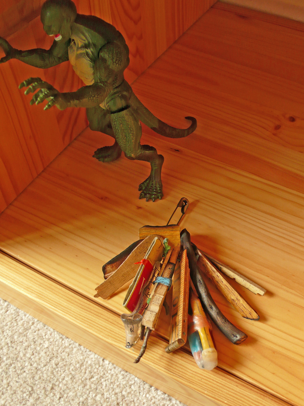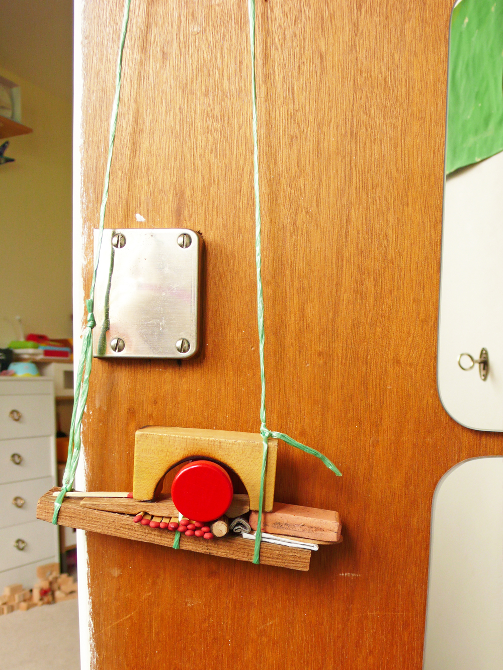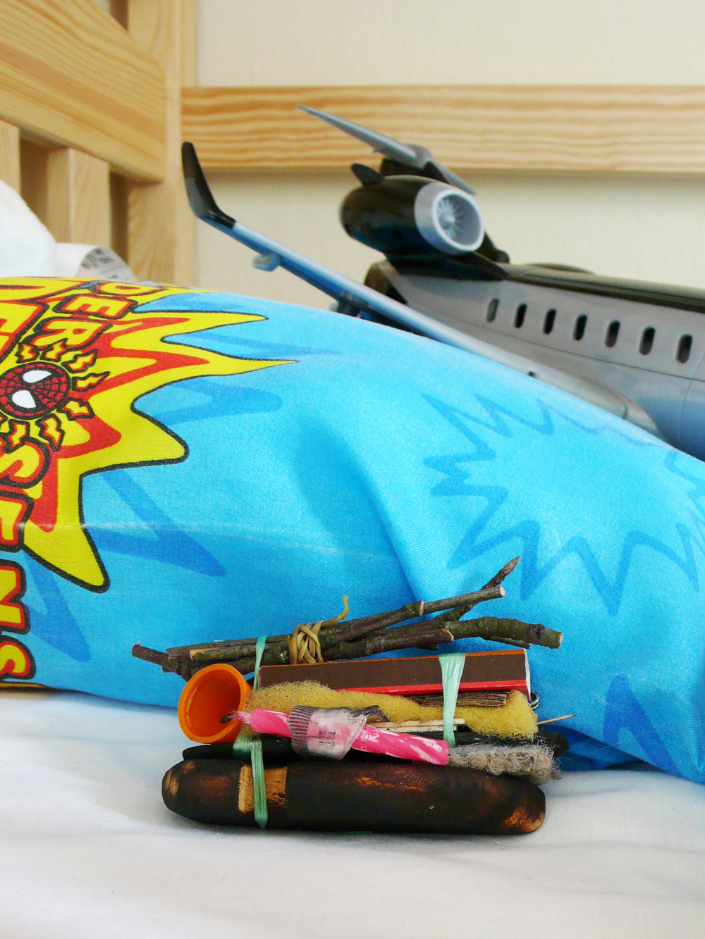 "Almost Caught in the Act" is a hoard of constructed artefacts discovered wedged in the gap between bunk-bed and wardrobe. The inexplicable disappearance of household items is no longer a mystery; their intended purpose barely disguised.