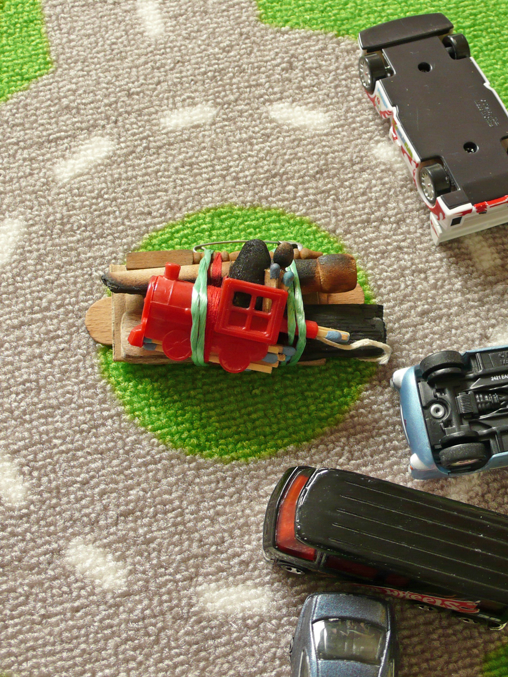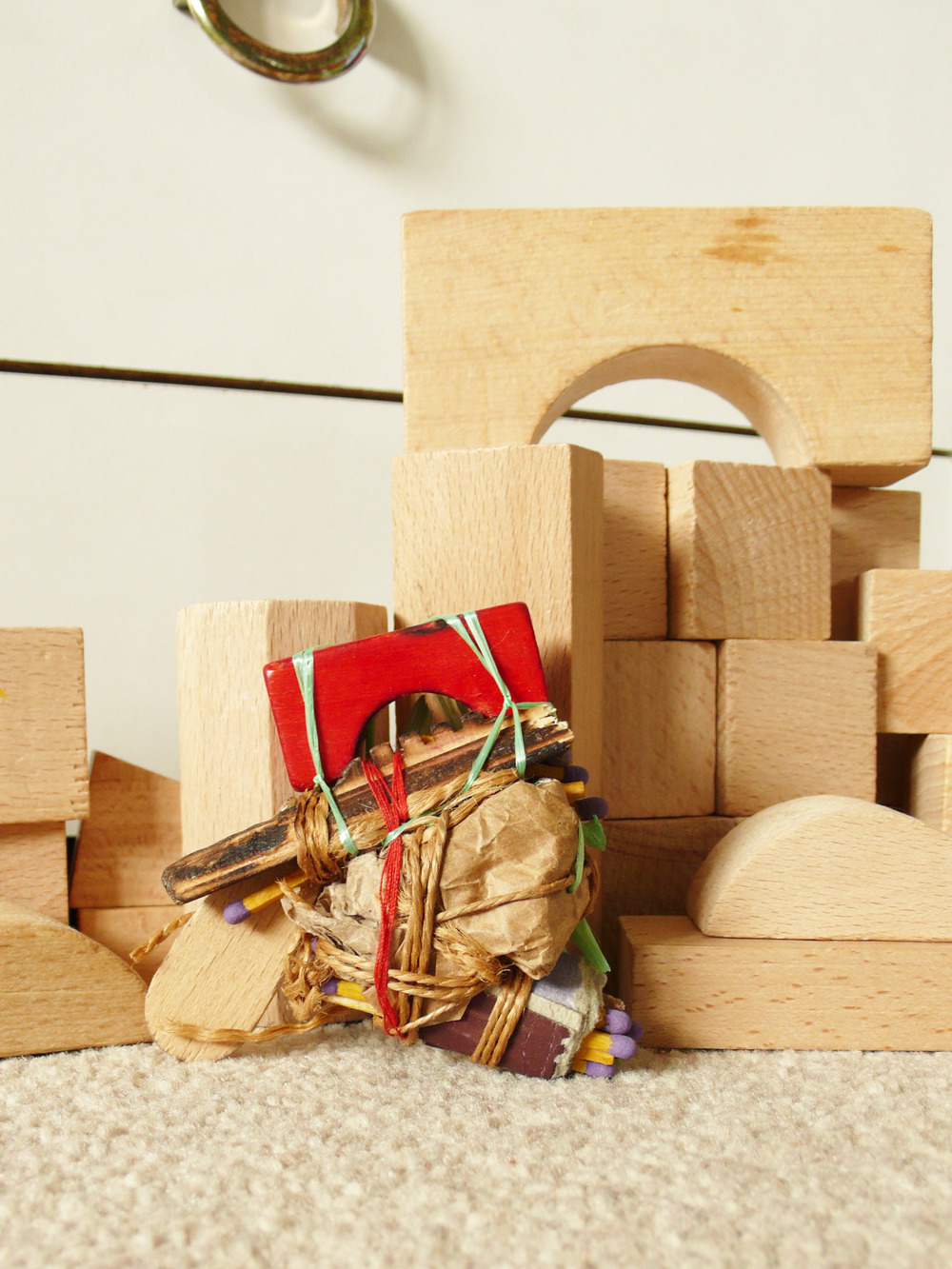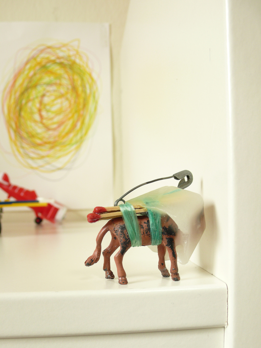 "Almost Caught in the Act" is a hoard of constructed artefacts discovered wedged in the gap between bunk-bed and wardrobe. The inexplicable disappearance of household items is no longer a mystery; their intended purpose barely disguised.